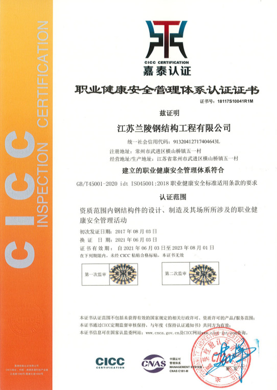 職業健康安全管理體系認證證書(鋼結構)