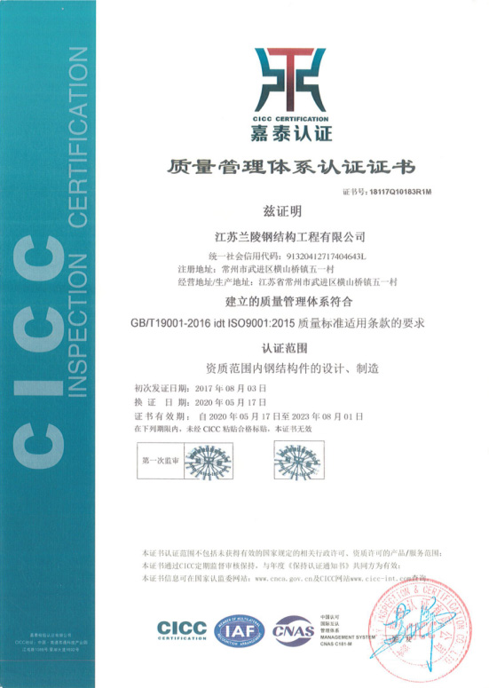 質量管理體系認證證書(鋼結構)