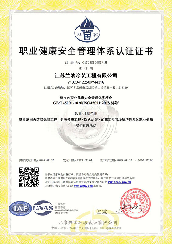 職業健康安全管理體系認證證書(涂裝)